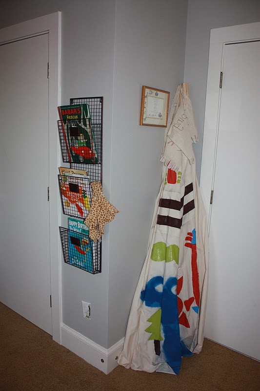 And loved the wire hanging baskets I found at Homegoods for books. The tee-pee in the corner is for campouts and was decorated by your's truly and my artists in residence.