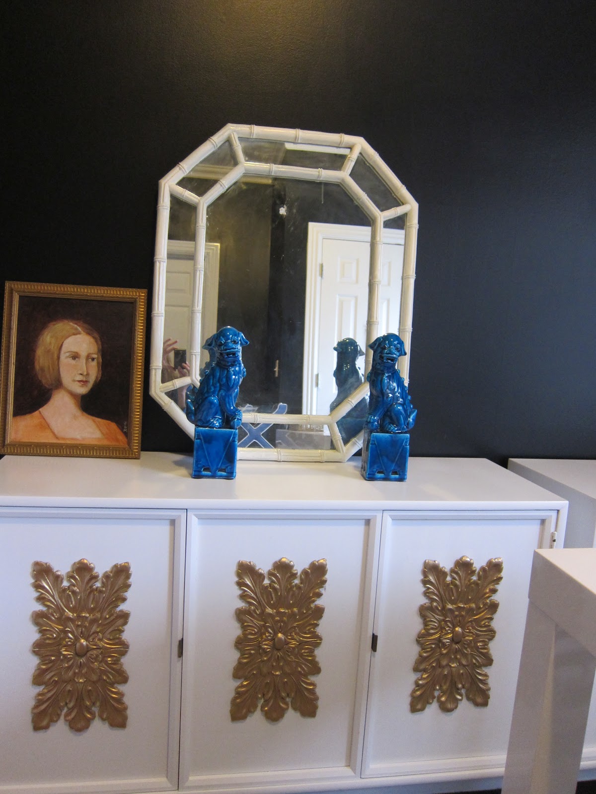 Oh, and not to confuse you but just to remind you, here is the current state of my office . . . it is painted black but basically has furniture and stuff crammed in it until I find a pleasing furniture arrangement and get my chandelier hung. Oh, and the credenzas are back from the painter. They look fabulous, but don't both fit in here (in the current arrangement), so I'm thinking one will be going in my daughter's bedroom at some point.